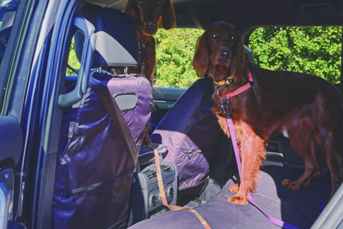 アイリッシュセッターのロイとソイ。「イギリスの狩猟犬なので、英国車が居心地いいのかも?(笑)」。