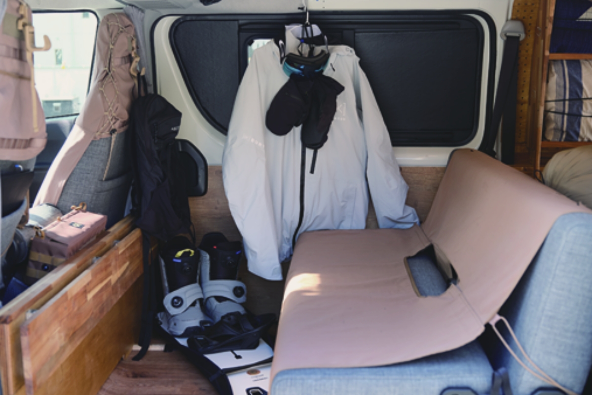愛用しているスノーボードギアはバートン。防水仕様のシートカバーを全席に装着。
