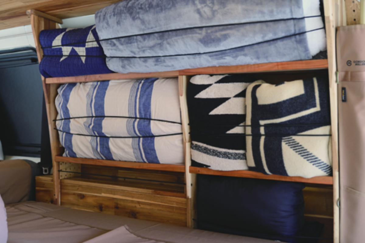 バンライフ仕様のラゲッジに備えた棚は、ウッド内装に合わせてDIYしたそうで、仕事で大きな荷物を運ぶこともあるので広い空間はそのままに、車中泊できる分割式マットレスも自身でセッティング。