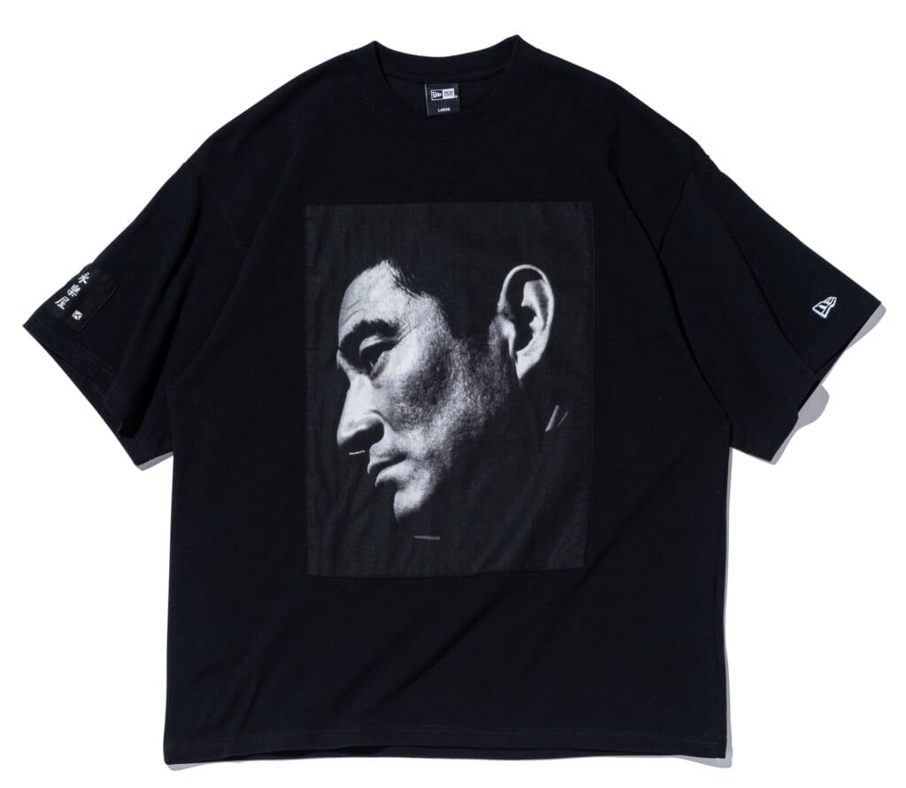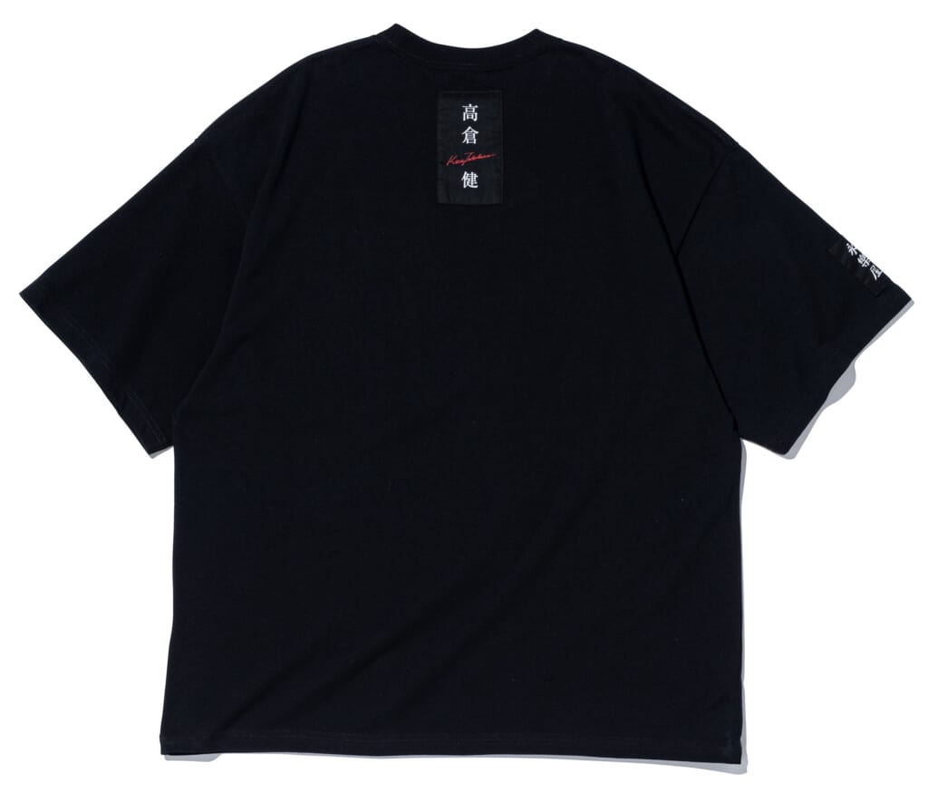 そしてオーバーサイズの半袖Tシャツにも、フロントに「高倉健」の横顔が大胆にあしらわれている。バックには「高倉健」のサイン、右袖には「永樂屋」の屋号をデザイン。