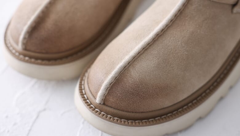 新作の筆頭であるタスマンラグは、ショート丈に仕上げたサイドゴア仕様。サトウキビ由来のEVAソールを採用し、センターシームのスエードアッパーを組み合わせている。募集加工が施されたフットベッド(インソール)はフワフワで肌触りの良い“UGGplush”と、テキスタイルの2種類が付属するので季節や気温に合わせて入れ替え可能。