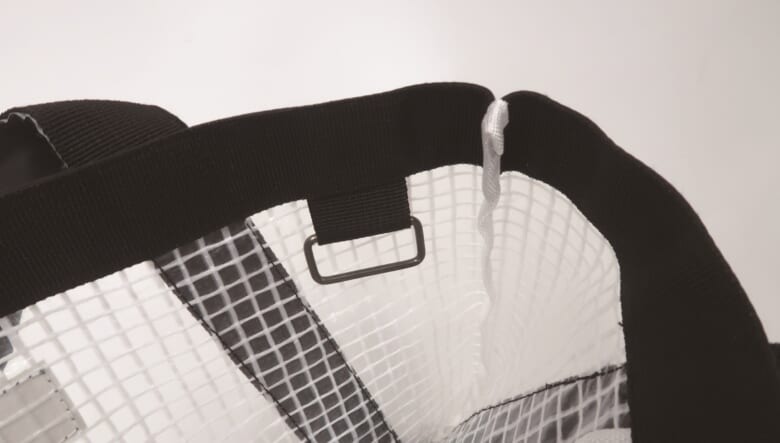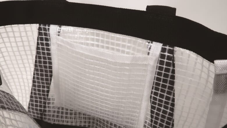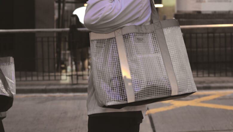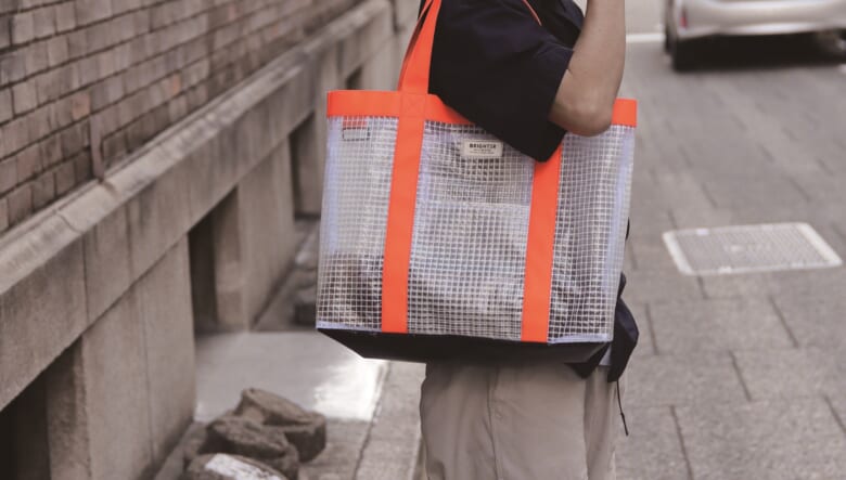 最後はリフレクター素材をハンドル周りに採用した半透明バッグ。程よい透け感を演出しつつ、クルマのライトなどに反射するから夜間の移動も安心! 底面には耐久性と汚れ防止を兼ねるターポリンを配し、内部にはインナーポケットとキーリングを備えている。