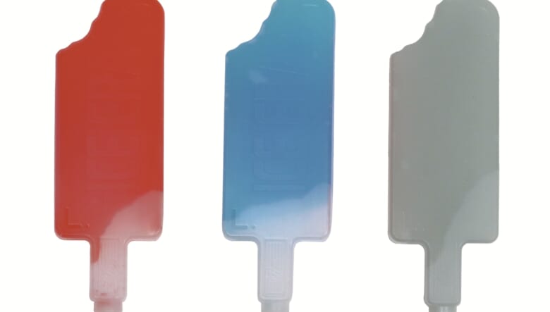 ソーダ味を連想させるブルーと、イチゴ味を彷彿とさせるレッド、さらに蓄光素材を使用した計3種がワンセットに。蓄光は15分ほど発光するのでキャンプでも便利なのだ。