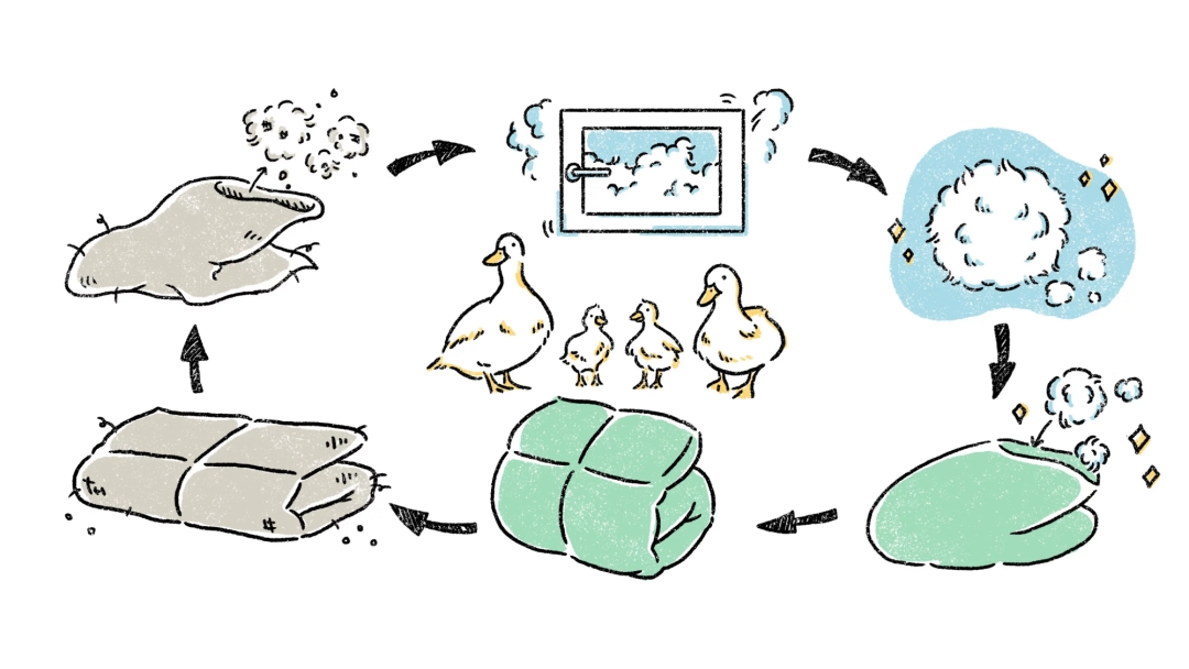 「Re:ACT」では、掛け布団のみならず、ダウンジャケットや寝袋への仕立て直しも行わている。しかし、その中でも製品ごとに適正な羽毛量があるために、仕立て直しの際に羽毛が余ることは避けらなかったという。そこで生まれたのが、その余り羽毛を用いた新たなアップサイクル製品だ。