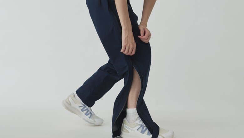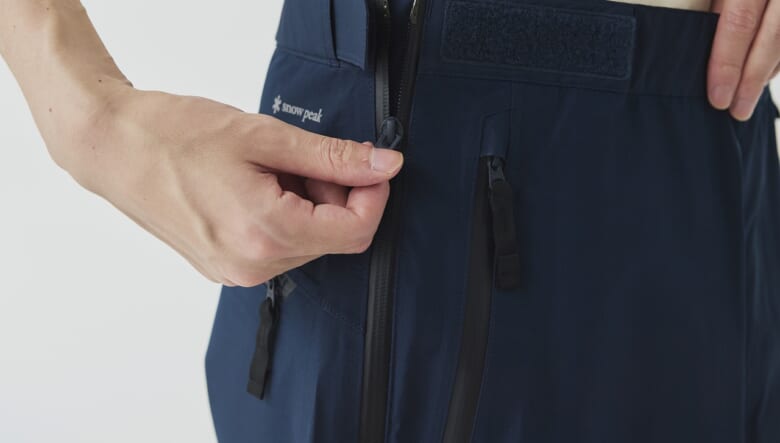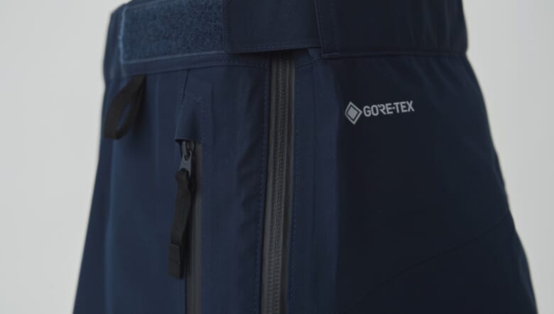 荒天下ではとくに濡れやすいパンツも抜かりなし! 股下は立体的にマチを設けて動きやすくしており、裾口はスピーディにアジャストできるベルクロ仕様に。ウエストはゴムでフィット感を高めつつ、こちらもベルクロのアジャスターで調整できるようになっている。