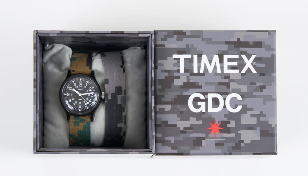 「GDC」では本モデルをベースに、ウォッチバックに GDC ロゴ・STA モチーフをレーザー刻印、ウォッチベルトをデジタル迷彩柄で アレンジしたアーバンミリタリーなデザインに昇華させた。