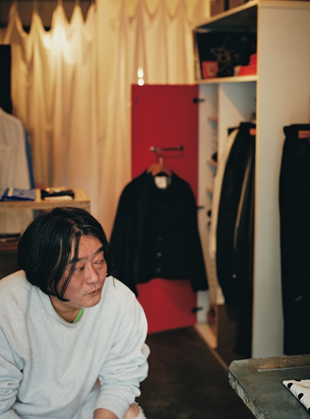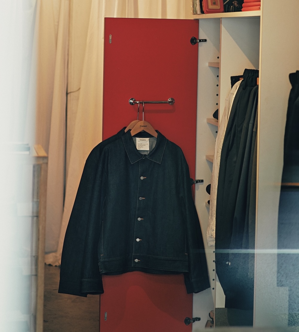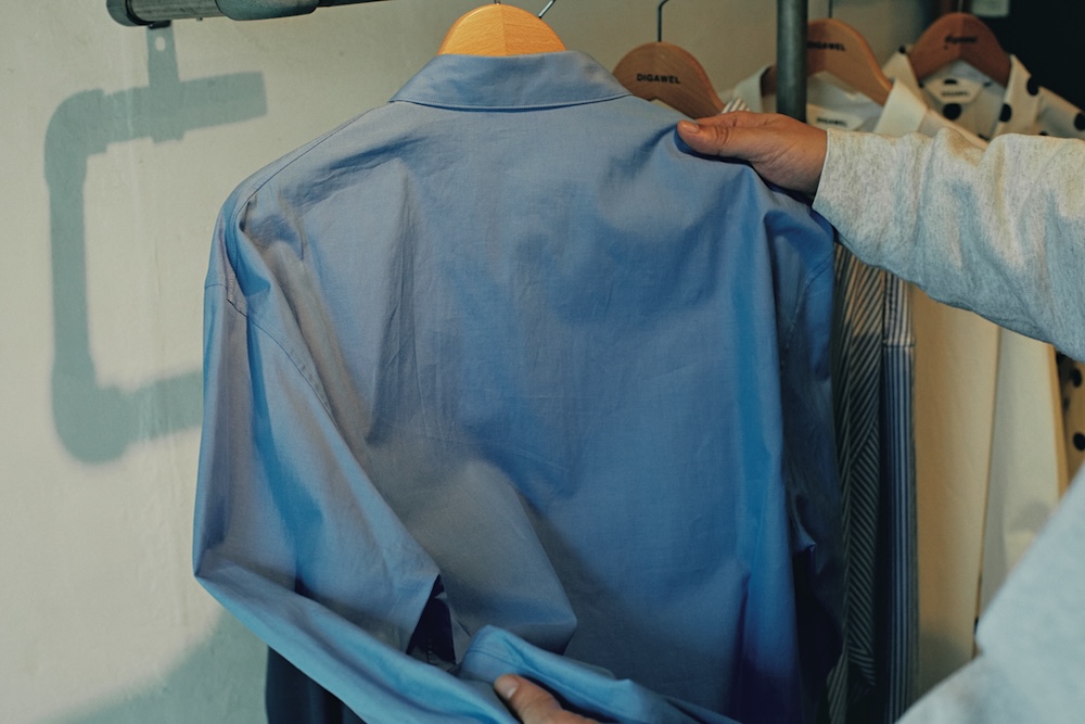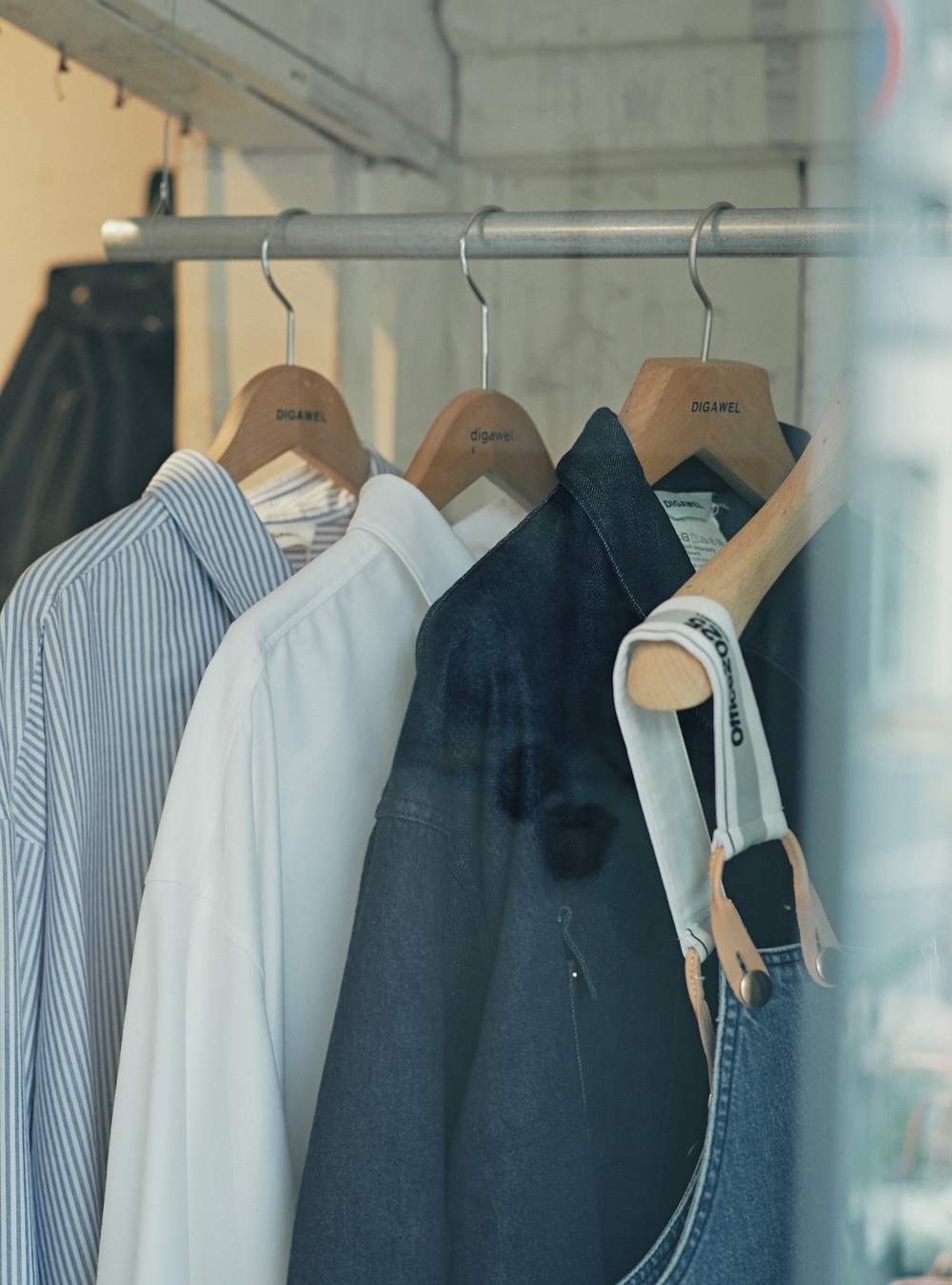 世田谷のセレクトショップ「山荘飯島」で、店主が好きだという、ディガウェルのウェアが吊るさ