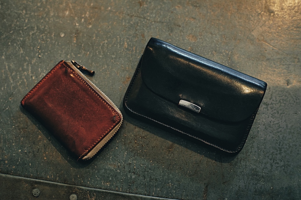 使い込んだときのギャルソンパースと、Lパース。右に写るブラックとブラウンとは同じものだったとはまったく思えないほど“味”が出るのが魅力。新品のときも、使い込んだときもどちらもカッコいい!