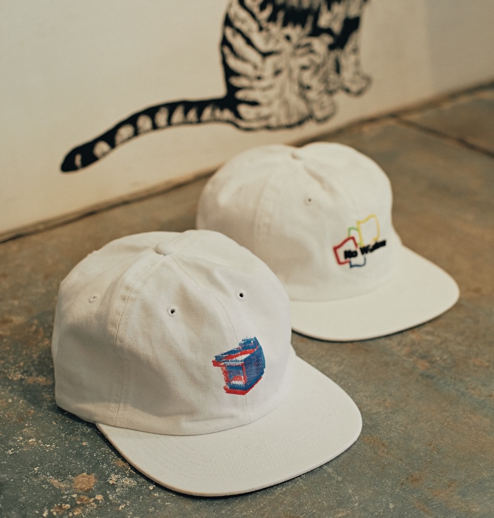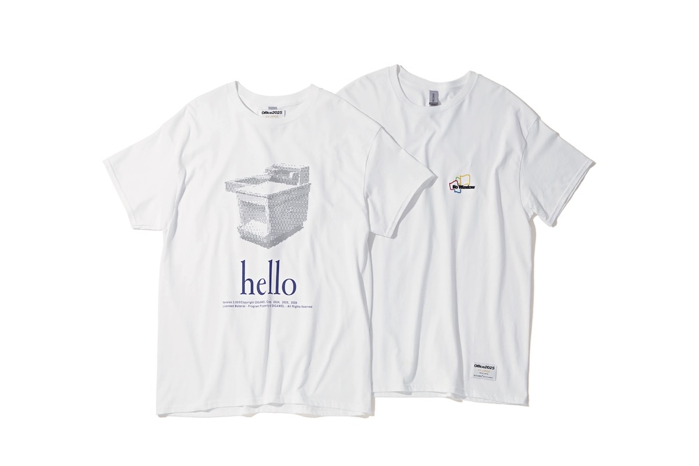 今季コレクションを感じさせる、既製ボディを用いて作られたTシャツ。左は初代オフィス用コピー機をドット絵でデザインしたプリントで、右は企業ロゴ風の刺しゅうを施す。