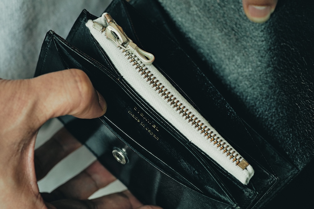 ギャルソンパースの開口時。完璧に計算された、驚くほど手に馴染むカタチも、耐久性とデザインの良さが挙げられるスイスの高級ファスナー“riri”」のジッパーも、すべて当時から変わらない不屈の名作だ。