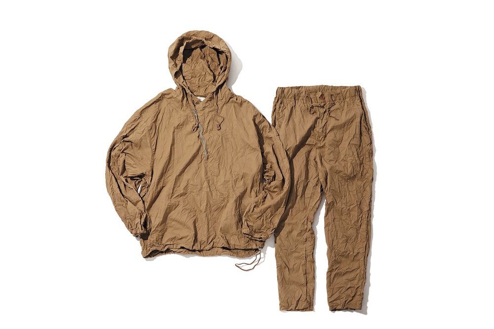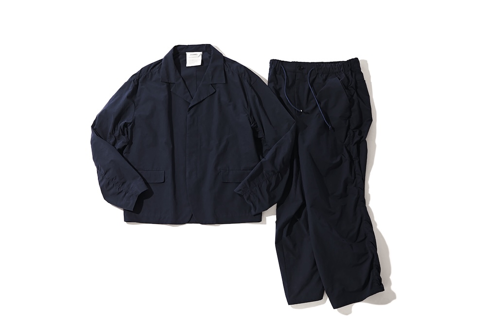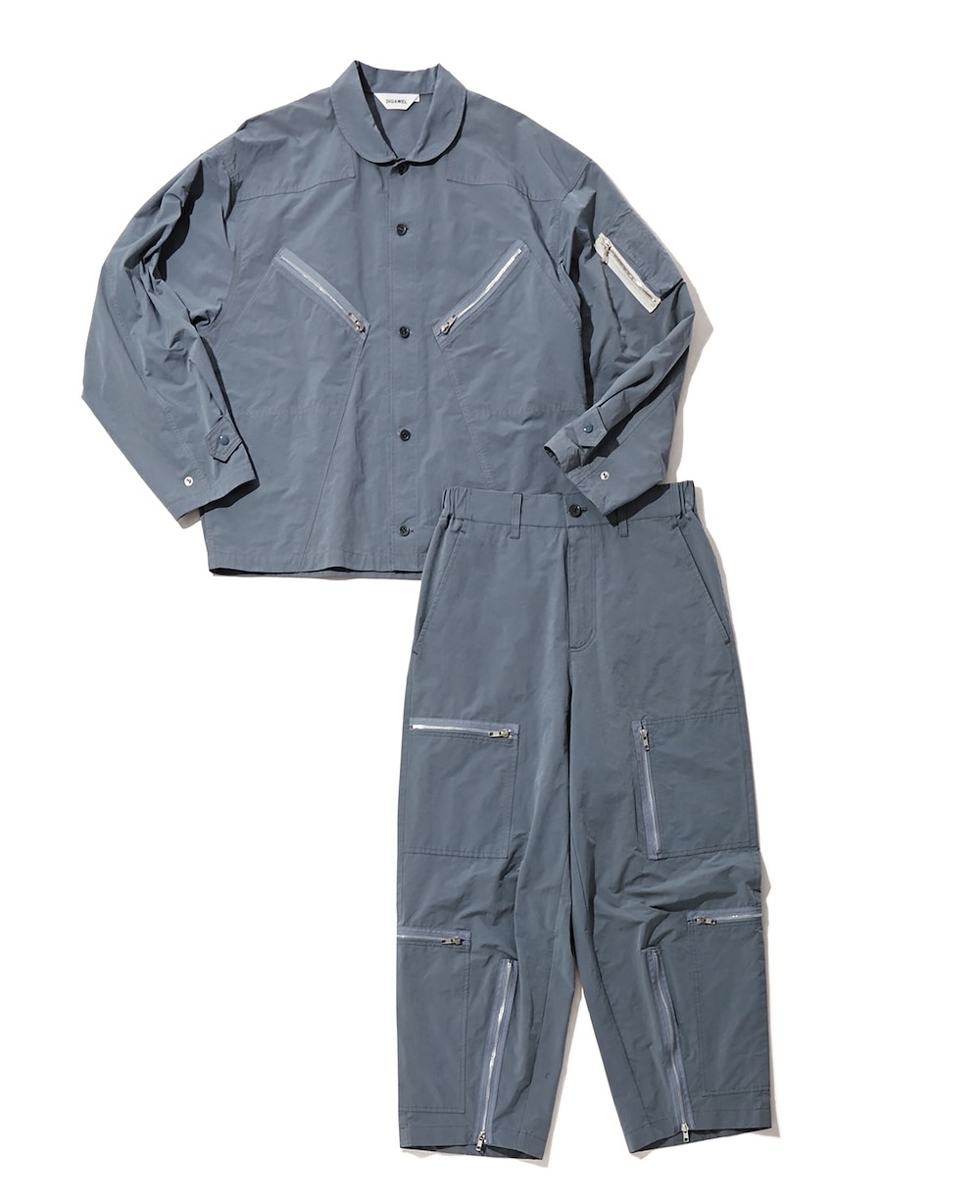 セットアップで着られるものが多いのが今季ならでは。上下の最大の特徴は製品加工されたシワ感だが、斜めジップやドローコードを用いたイージーな着やすさもウリ。