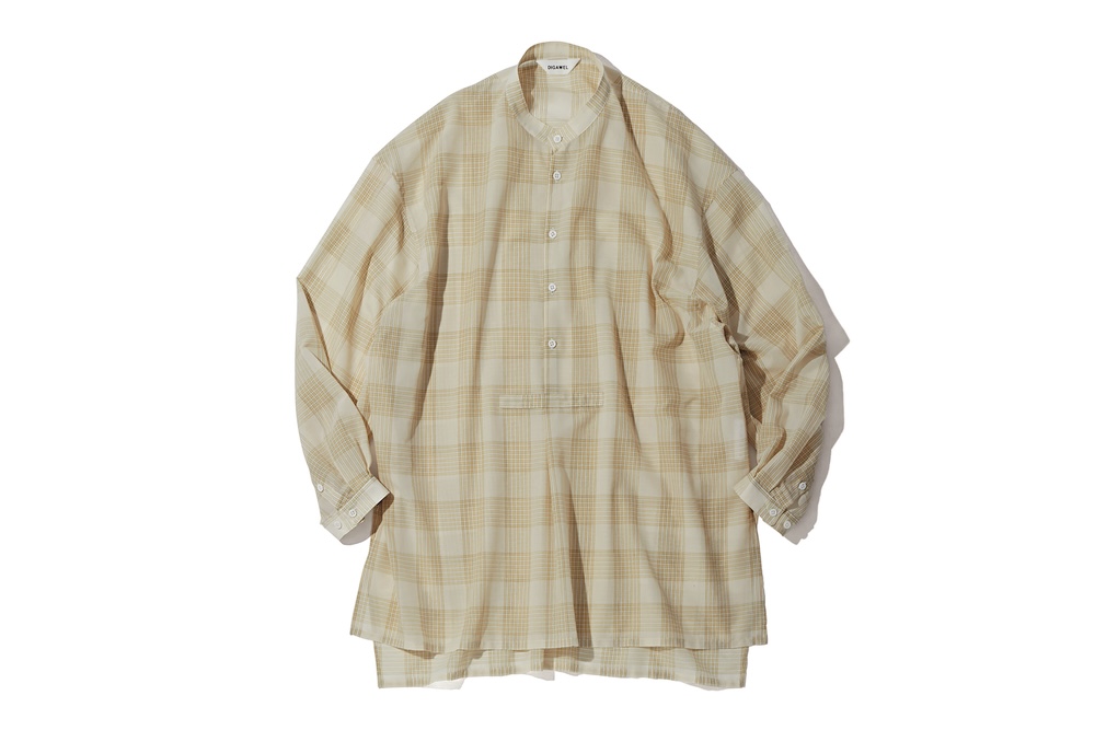 2シーズン継続でラインナップされた、前と後ろで長さの違うチュニックシャツ。今季のものは透け感のある生地を使用し、ギャザーなども無くしたことで、より軽い見た目となっている。