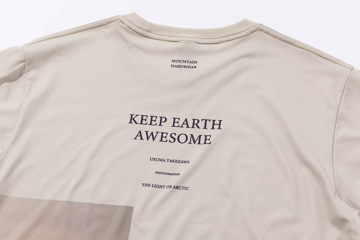 マウンテンハードウェアがアースデイをきっかけに環境問題への関心醸成を願って作る「Earthday Hardwear T(アースデイハードウェア T)」。今年2025年は、1021日間で世界103カ国を旅した写真家、竹沢うるま氏とコラボレーション。彼が北極犬ぞり遠征の際に見た「白夜の光」を大胆に落とし込んだデザインになっている。