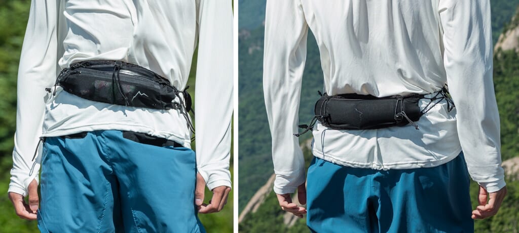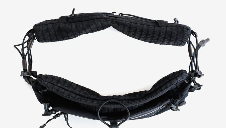 具体的には、前後に収納スペースを設け、前側には4つ、背面には2つのポケットを設置。さらにジャケットやタオル、ポールなどが外付けできるストリングコードも備えている。単体での使用はもちろんのこと、バッグパックと合わせて使えばさらに機能性アップ!