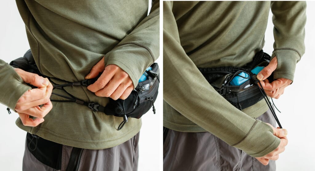 ワンサイズ展開でウエスト周り約70~88cmまで対応。フィッティングは右側バックルを装着し、ストリングコードでサイズを調整。その後、前後のストリングを引っ張って体に引き寄せるだけだ。
