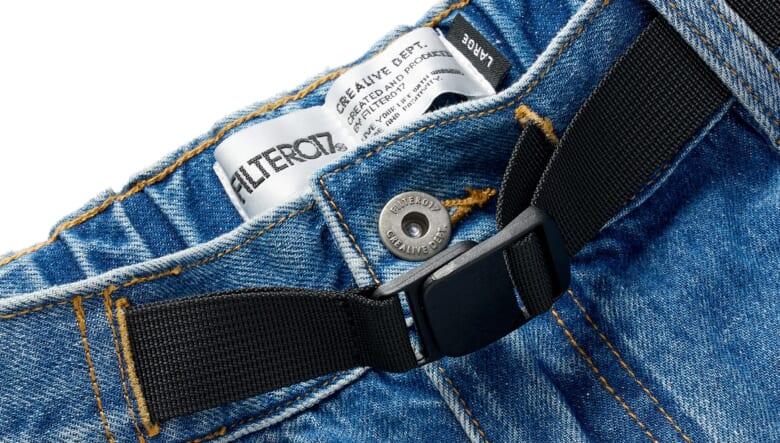 気になるシンメトリーデザインは、ミリタリーの名作M65カーゴとファティーグパンツをドッキングしたという思い切りの良さ。奇抜なようですぐ目に馴染んだのも頷ける。ナイロンコードのベルテッドデニムなのでアウトドアスタイルにももちろんハマるぞ。