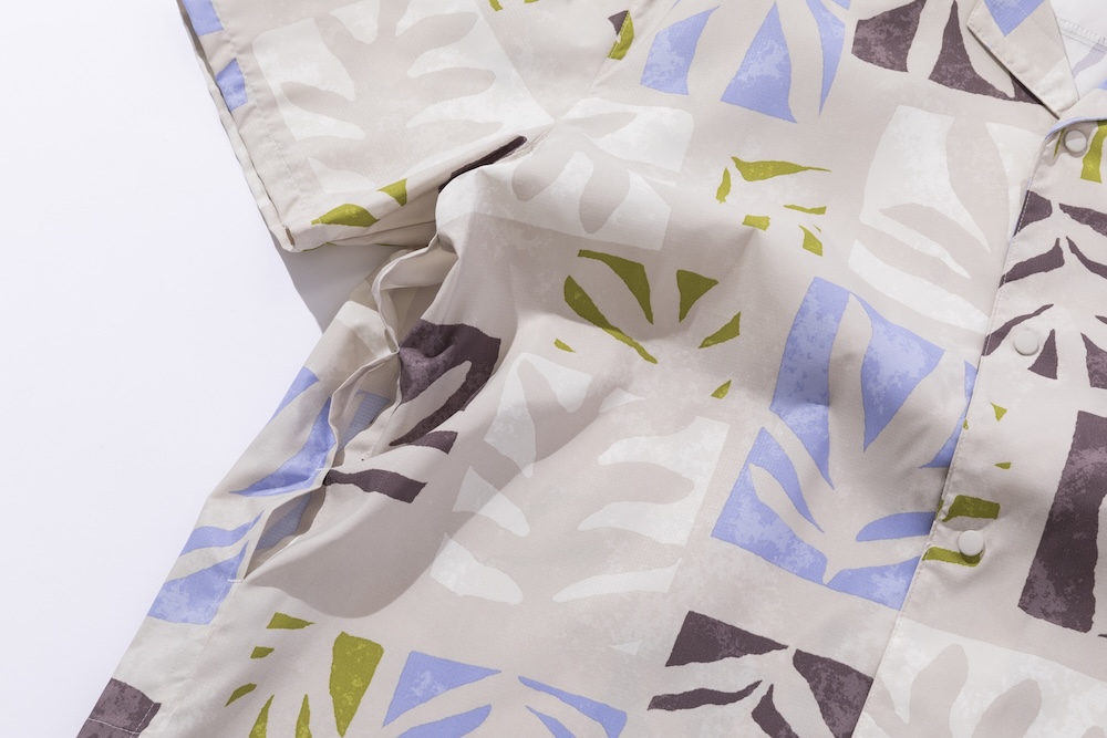 まずは、軽量で、耐久性と伸縮性を兼ね備えた生地を使用したショートスリーブシャツに注目。フロントはスナップボタン開閉で、襟はオープンカラー。ゆったりとしたシルエットバランスも特徴です。