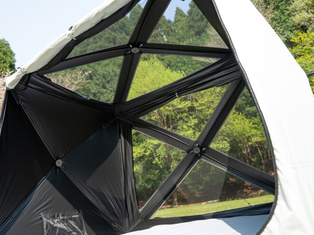 前後メッシュの構造により通気性もバツグンで、熱を逃がしてくれる。天井には開閉可能な大型の窓が設けられているので、換気だけでなく、彩光もできるようになっている。