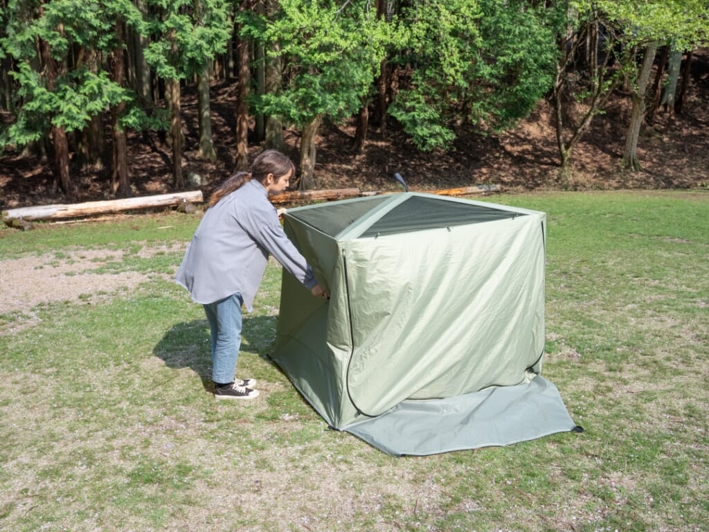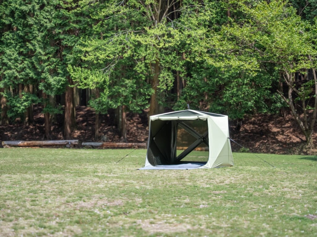 続いてのアイテムは、傘のような構造を持つタープテント。プッシュボタンによるワンタッチで即展開できるので設営が簡単だ。