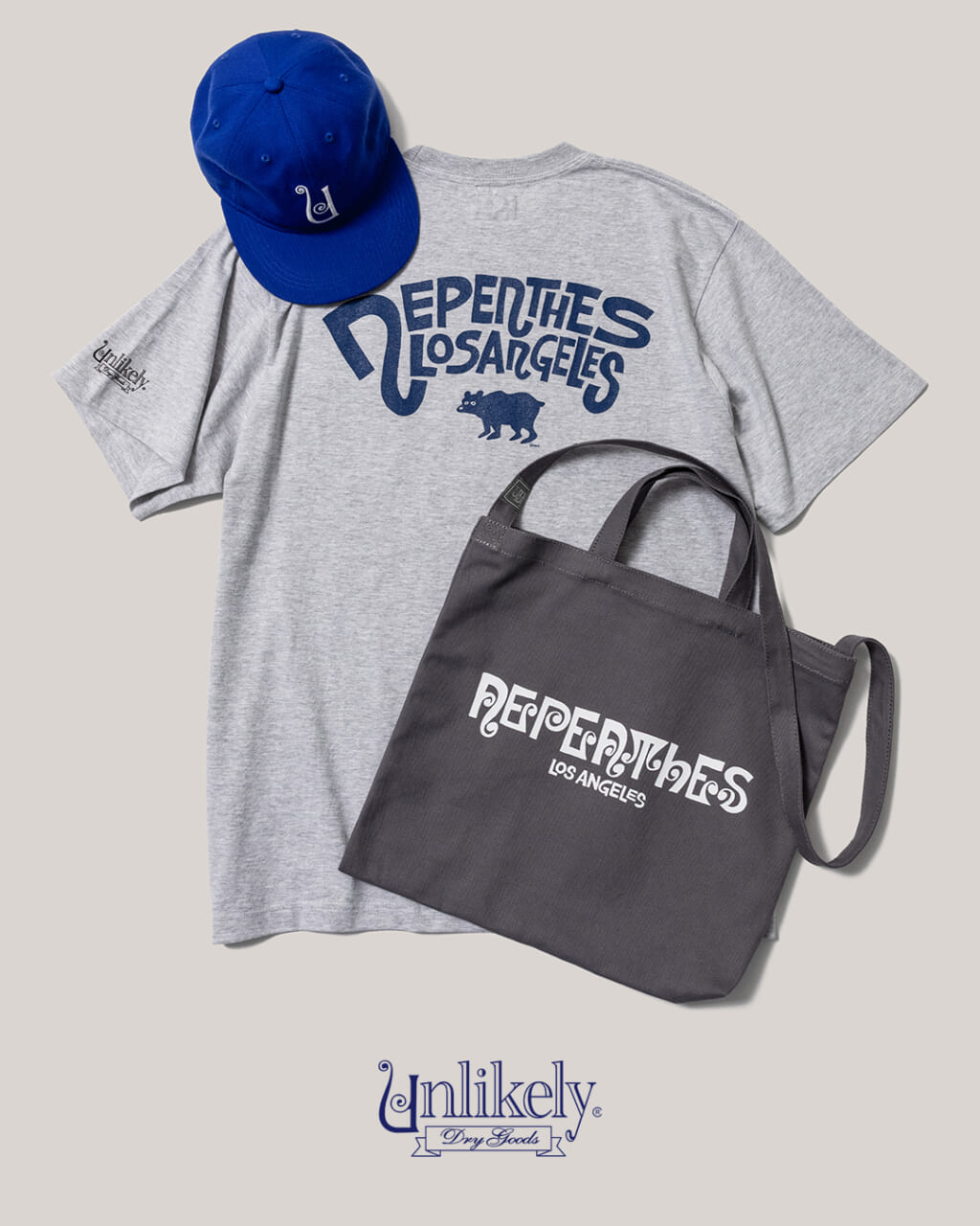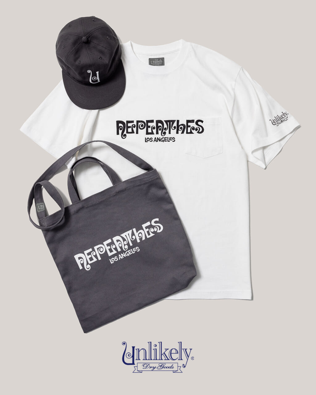 今回のポップアップでは、「NEPENTHES」の“Nロゴ”を逆さに施したベースボールキャップの“LAカラー”をはじめ、アーティスト花井祐介氏が両ブランドのロゴを描き下ろしたポケットTシャツやキャンバスバッグなど、LAの雰囲気をまとった「Unlikely」らしいアプローチのスーベニアアイテム全 4型がラインナップ。