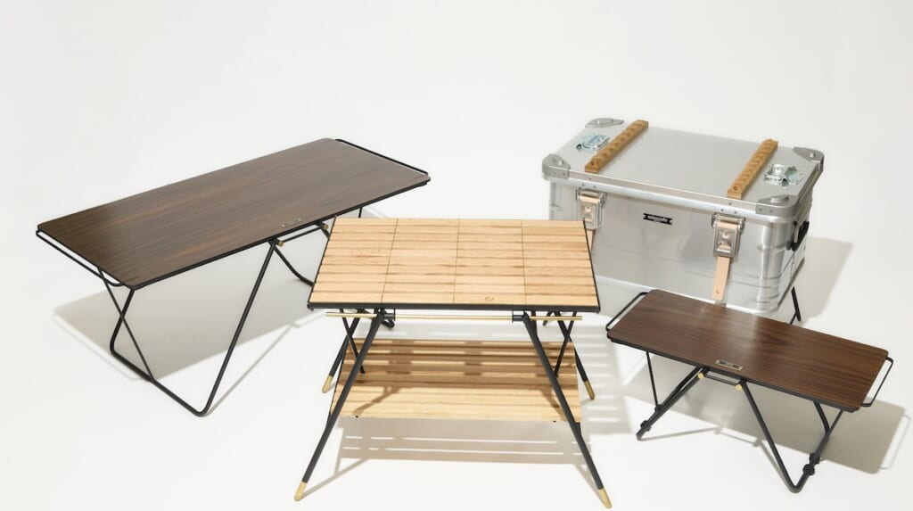 サイトの要となる、キャンプファニチャーも多種多様な顔ぶれ。例えば、それぞれ「ノデルデザイン」とコラボしたテーブルは、リビングでも違和感なく使えそうな洗練されたデザイン。
