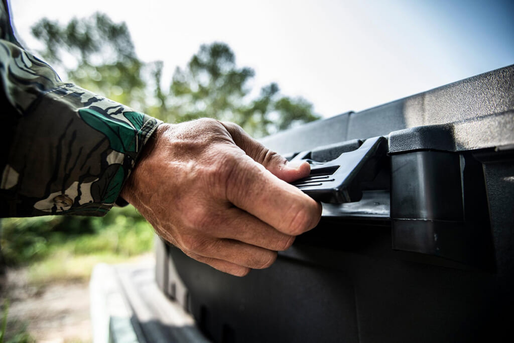 高いデザイン性に加え、最新テクノロジーによる耐久性と多用途性を突き詰めた“スポーツマンズトランク”には、操作性に優れた大型ラッチが採用されています。このラッチを外すことで蓋ごと取り外すことも可能。
