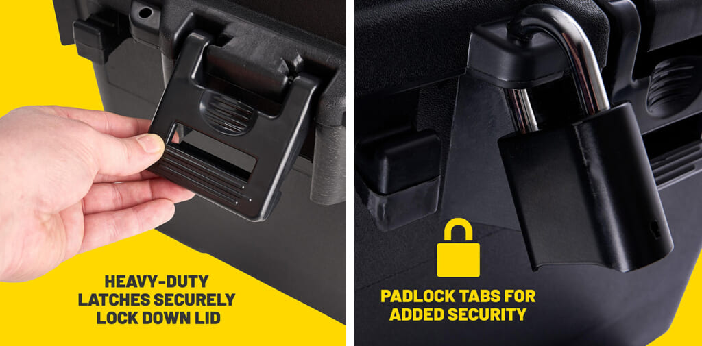 また、蓋上部に凹凸があり、スタッキングしても安定感バツグン。市販の南京錠を使用すれば施錠することも可能なので、ご自宅やガレージでの大切なアイテムの収納にも使えちゃいますね。