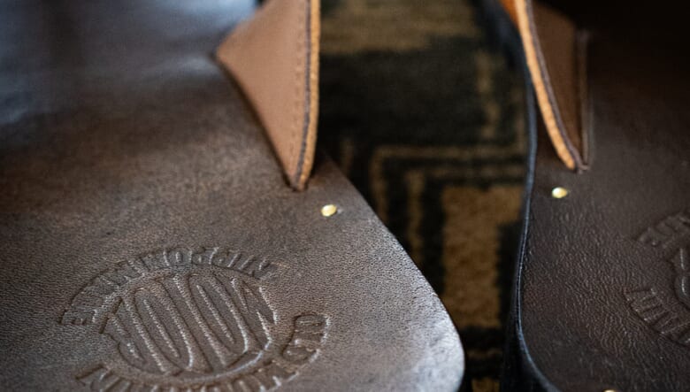 伝統的なハンドメイドワークと独自のアートセンスが高く評価されるレザー&シルバーブランドの「MOTO(モト)」とのコラボレーションで誕生した無骨なレザーサンダルは、ラクダ革のアッパーと牛革フッドヘッドを採用した贅沢な一足。