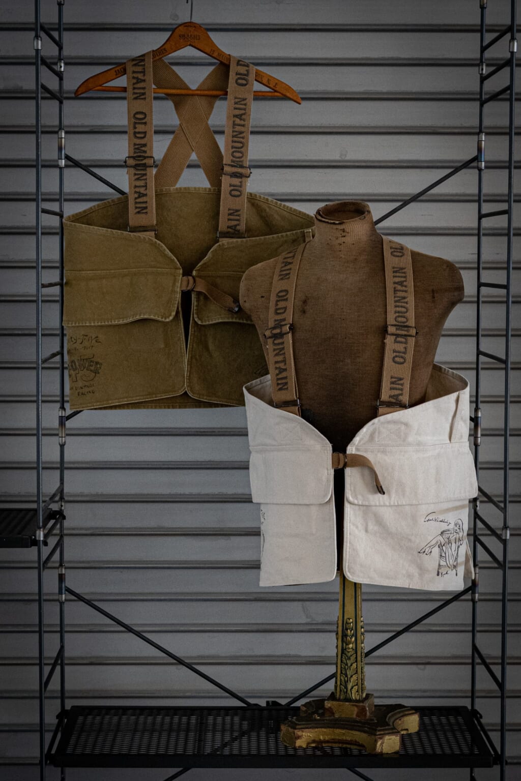 背面や両ポケットに描かれた40〜50年代のアメリカンカルチャーを想起させる絵柄は、ハンドペイントにより、やれた古着のような雰囲気に。エイジング加工の施されたショルダーストラップとは相性バツグンで、ヴィンテージ好きには特に刺さるポイントだ。また、背面にもついた大容量ポケットとオーバーベストとして着られるサイズ感は、季節を問わず外仕事での強い味方にもなってくれそう。