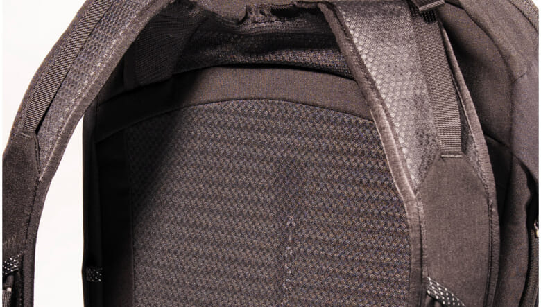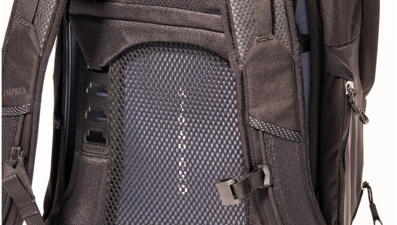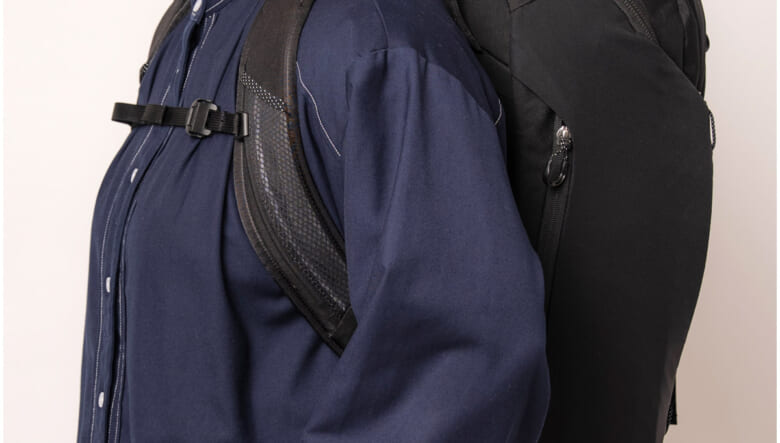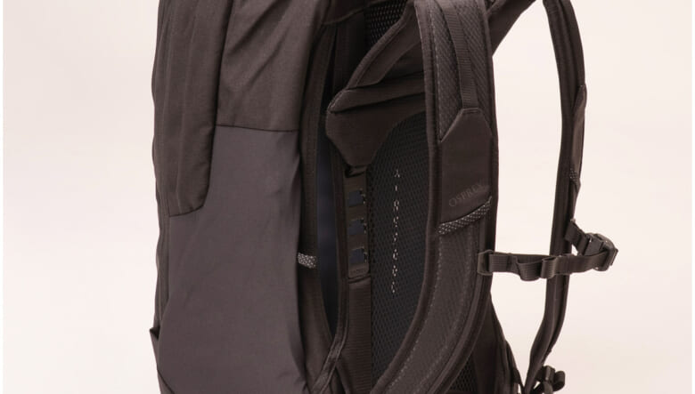 容量を26Lから34Lまで拡張できるメトロンエアスピードは、バックパネルを採用してフィット感の調整が可能。メッシュ素材で通気性にも優れ、背中に熱がこもりにくい。