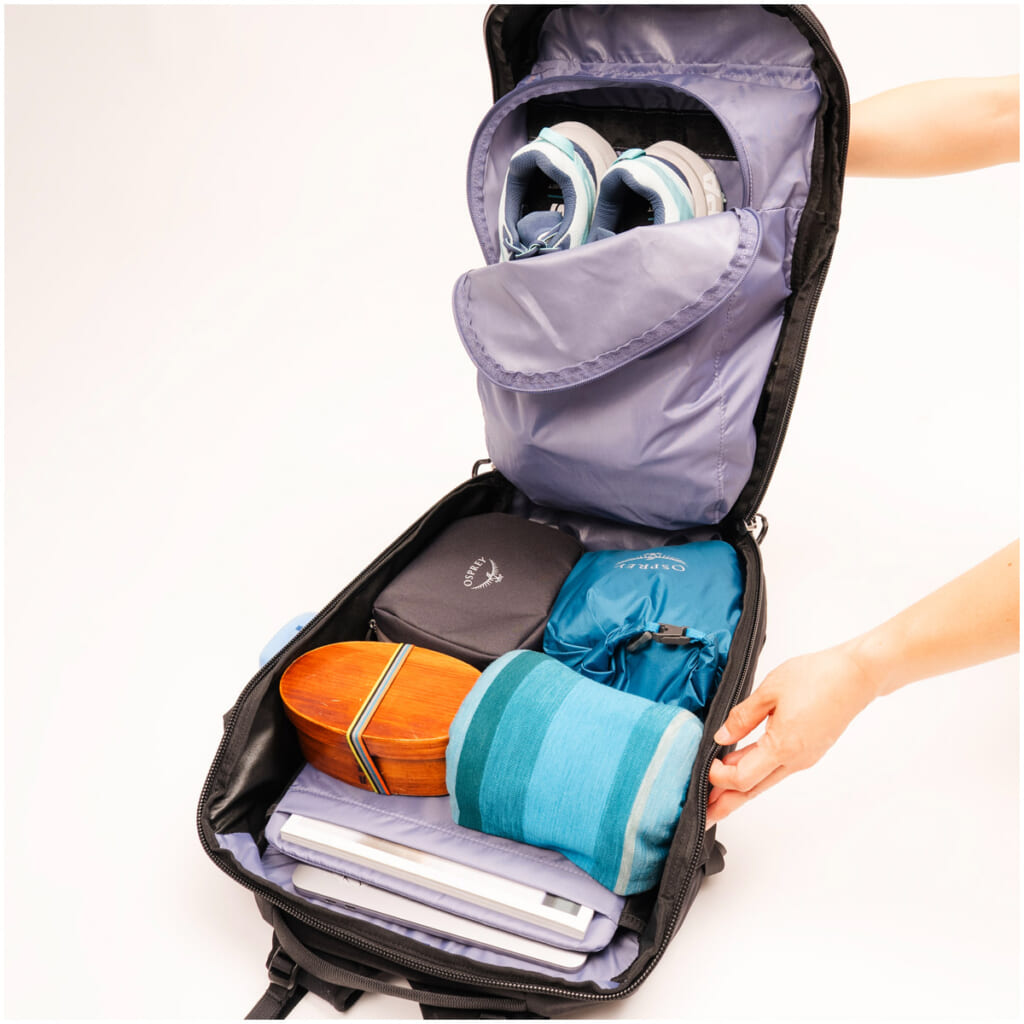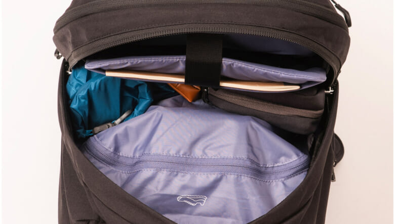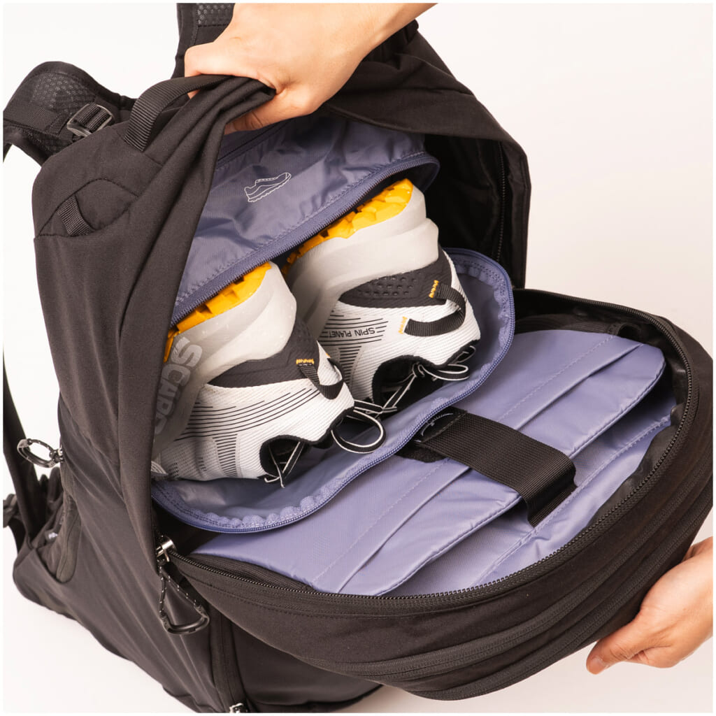 パックを自立できるキックスタンドによって荷物の出し入れも行いやすく、メインコンパートメントにはシューズなどを分けて収納できる。
