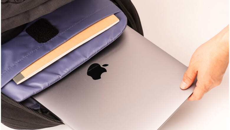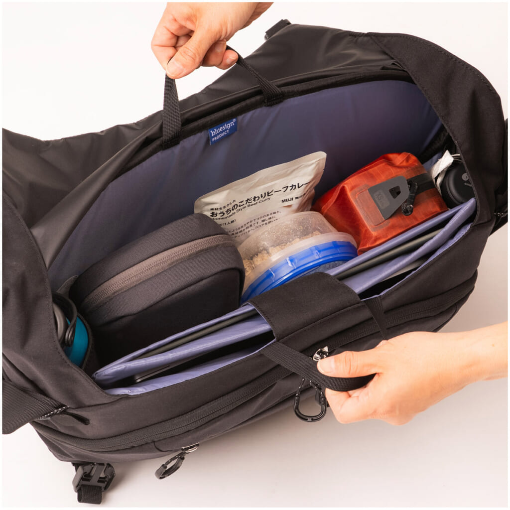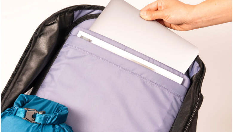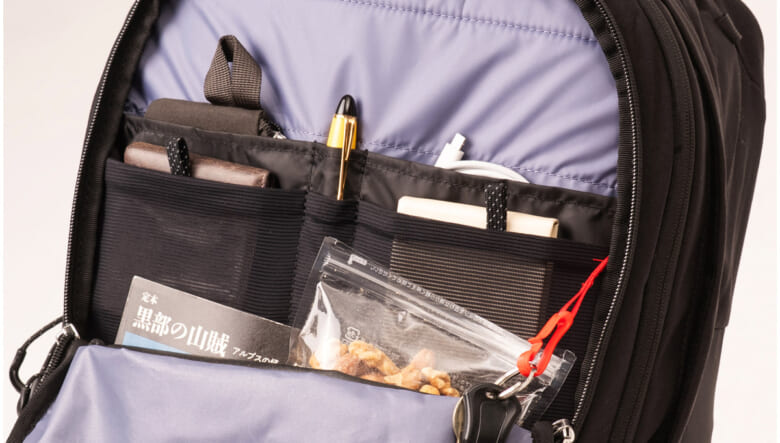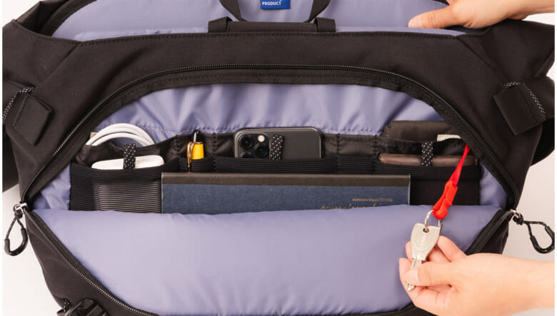 内部がセパレートされたメイン収納に加え、16インチまで対応するPCスリーブも備えている。また両サイドにはボトル類や折り畳み傘にフィットするストレッチポケットを、財布やパスケースなどの小物に最適なファスナーポケットも用意。