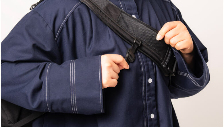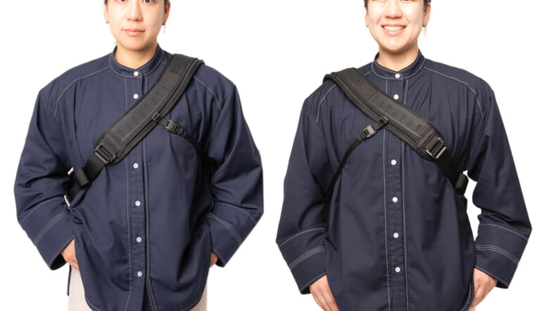 ショルダーストラップを付け替えることで左右どちらでも使用OK! スタビライザーストラップもあるので自転車移動時も安定させられる。