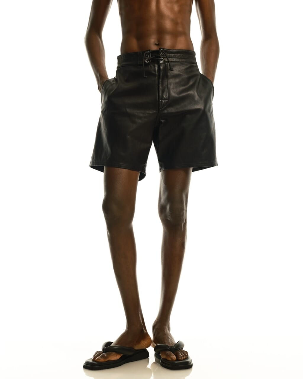 そして、そのレザーを使用したエポックメイキング的なプロダクトがこちらのボードショーツ。ビーチやプールで水着として着用可能で、デイリーにも着用できる優れもの。長く穿いていると、撥水機能が落ちてきますが、アイロンなどで熱を加えることで復活するそうなので、ご安心を。