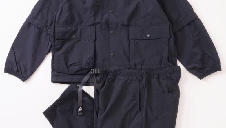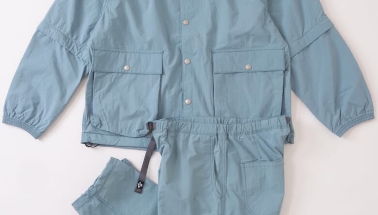 トップスとボトムスともにクラシックなデザインが基調で、素材は前述のように肌離れの良い現代のナイロンボディを搭載。温故知新な物作りで生まれたセットアップは、街でもフィールドでも常に新鮮なキブンで心地良く着こなせます。