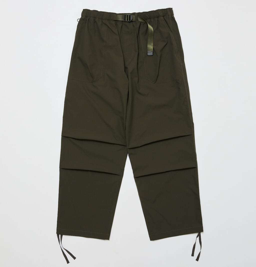肌触りのよいコットンナイロンオックスでマウンテンパンツをメイク。ワイドテーパードストレートのシルエット、ダーツ入りのヒザ、伸縮性あるウエストバンド、樹脂製バックル付きウェビングベルトなど、動きやすくノーストレスで穿ける工夫が随所に。