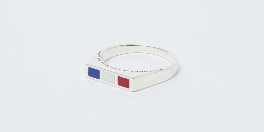 ややスマートなシグネット型ピンキーリングに溝を3つ掘り、トリコロールのエポキシ樹脂でデコレート。ボディには質のよい925シルバーを使用する。エポを注入していないシンプルバージョンも存在。