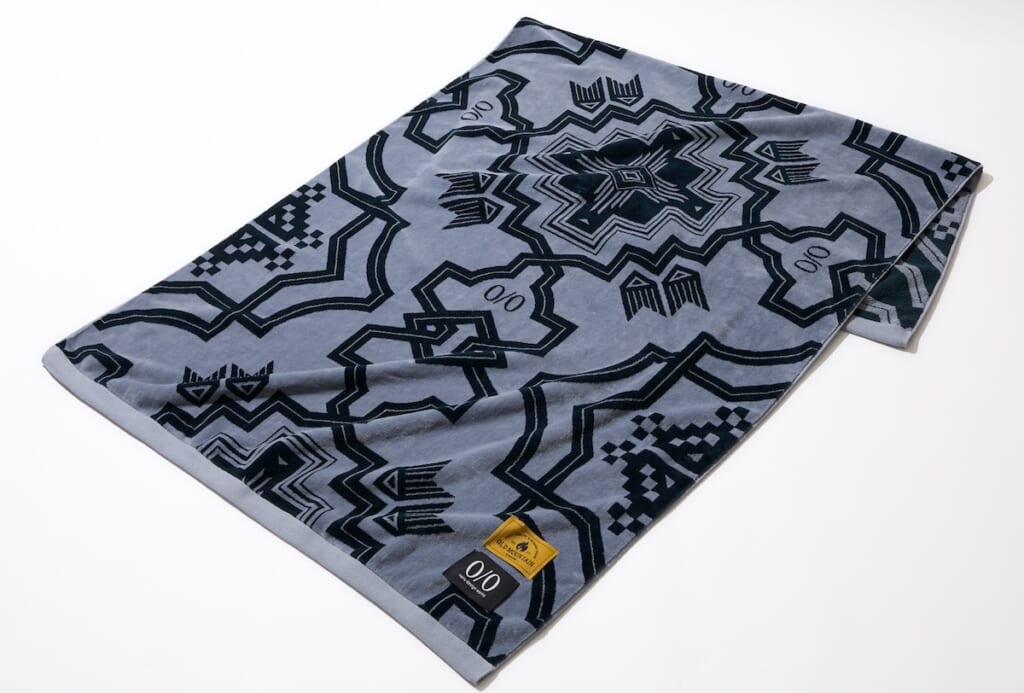 オールドマウンテンのオリジナルのオルテガ柄のなかに、さりげなく0/0ロゴも入ったエクスクルーシブなデザイン。今治産のタオル生地で、上質で優しい肌触りが魅力。