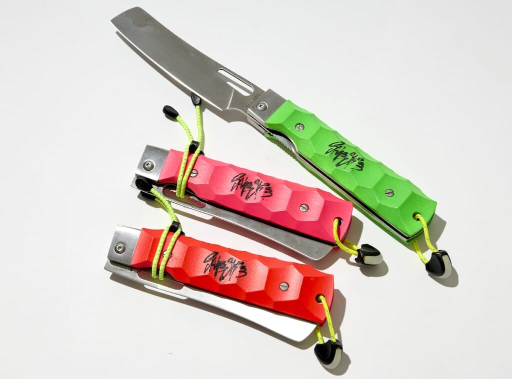 お酒大好きキャンパーから発信されるブランド、サケスキーとコラボしたアウトドア包丁は、“アシグリップ”をカラフルに仕上げたポップなスタイル。