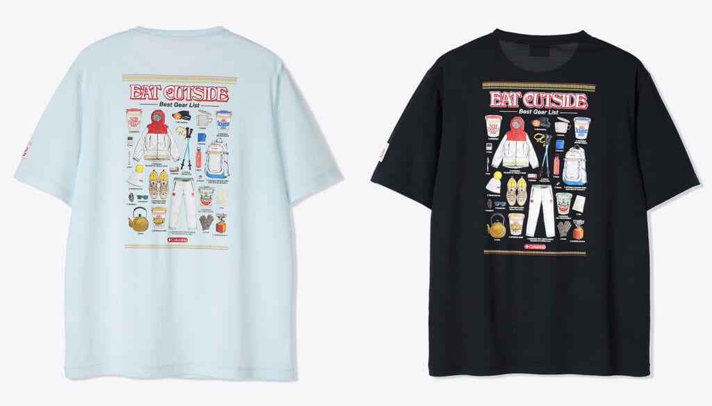 Tシャツの背面には、登山をする際に必要となる Gear List(持ち物リスト)をデザイン。“EAT OUTSIDE”のメッセージのもと、「カップヌードル」シリーズの商品パッケージや、ギアのイラストがちりばめられている。