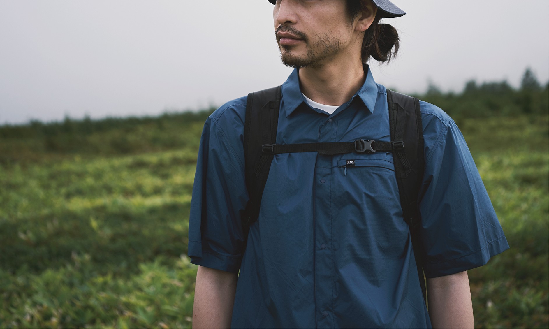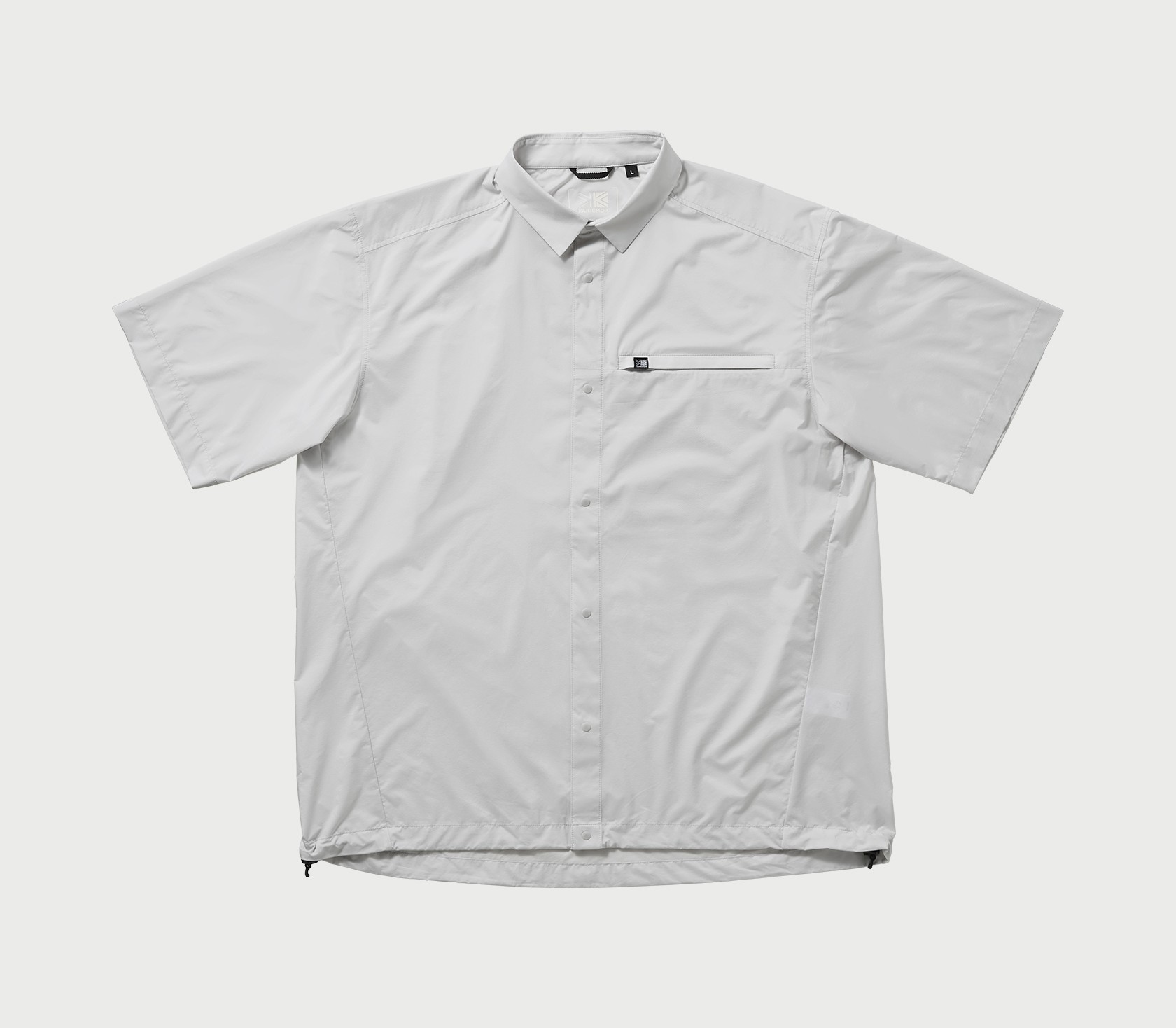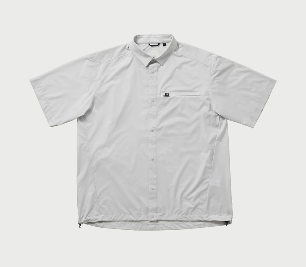 最後はハーフスリーブシャツをチェック! ナイロン素材を用い、スナップボタン&ドローコードの裾でライトに着回せる一着だ。耐久撥水加工の二重織生地は肌離れも良く、快適さをキープする。