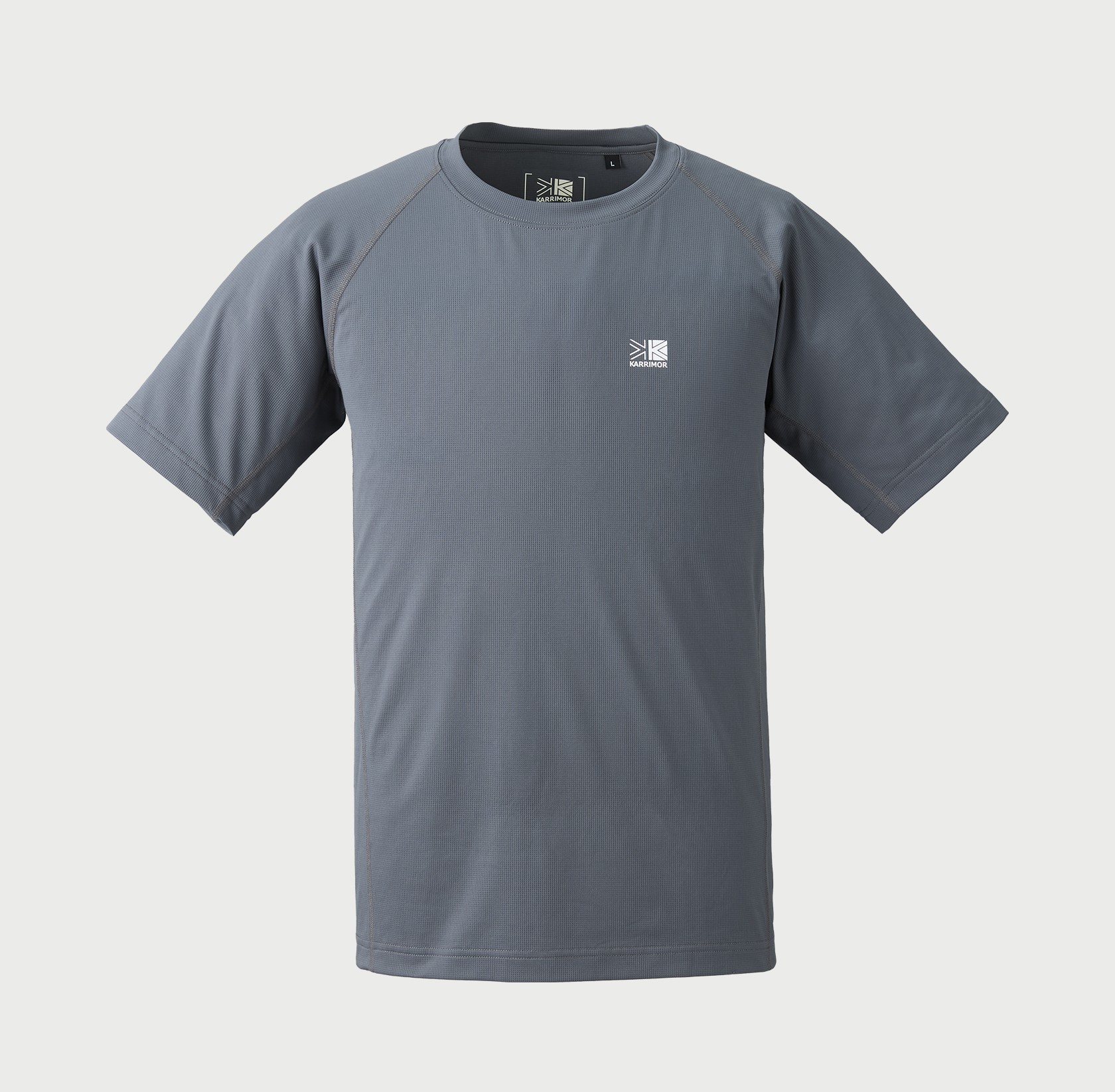 fast-dryシリーズの半袖Tシャツは、生地が吸った汗の戻りを抑える軽量モデル。優れた吸汗速乾性とUVカット機能を持ち合わせており、肩周りの可動域を広く取ったラグランスリーブの雰囲気も相まってアクティブなシーンで活躍する。