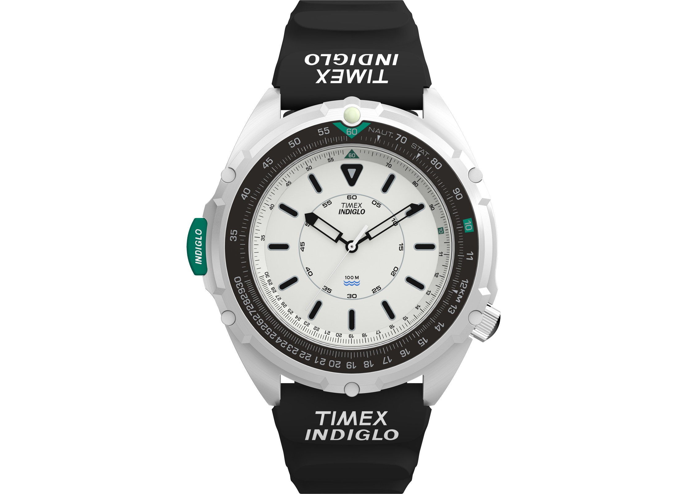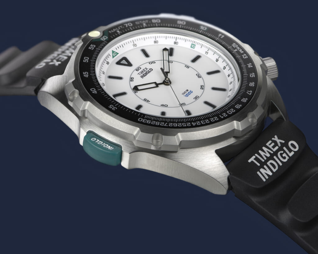 また、ケースサイド9時位置にある緑のボタンを押すと“インディグロナイトライト”が点滅。今では当たり前の搭載されているが、1992年にタイメックスが開発した文字盤全体を青緑色に発光させるこの機能は画期的なものだった。