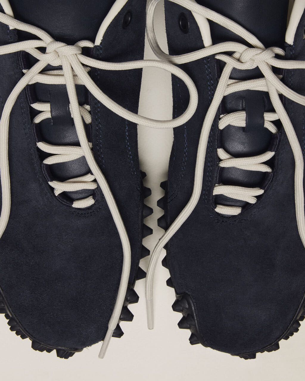 アッパーにはプレミアムヌバック、ライニングには柔らかなレザーを採用し、ブラックのスパイクソールという組み合わせ。1999 年に登場したオリジナルの「MOSTRO」に付けられていたストラップ仕様とは異なり、今作ではよりミニマルなシューレースタイプが採用されている。