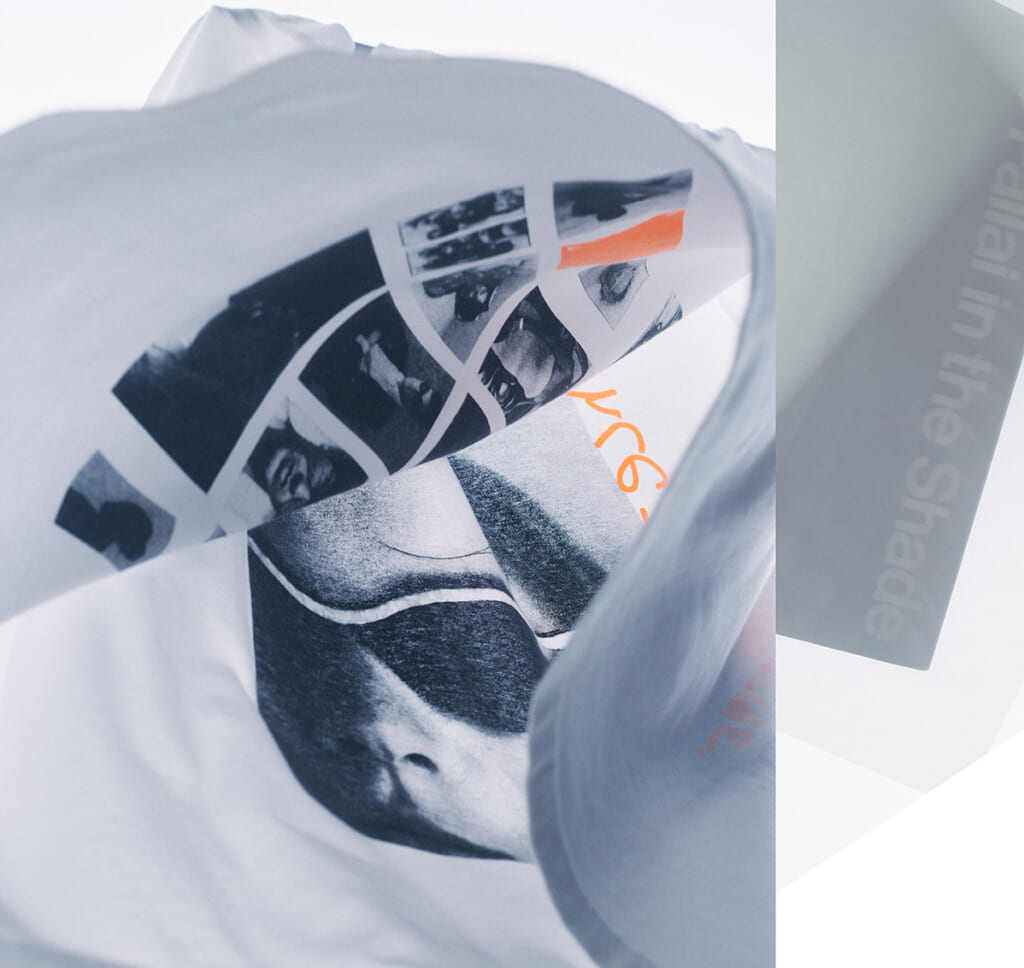 そのメッセージを表現すべく、グラフィックはTシャツの内側にシルクスクリーンでプリントをオン。染み込んだインク(陰)が光の透過により浮かび上がるよう設計された視覚表現は、「Lunetta BADA」のプロダクトが持つ光と陰の美しさを巧みに映し出している。