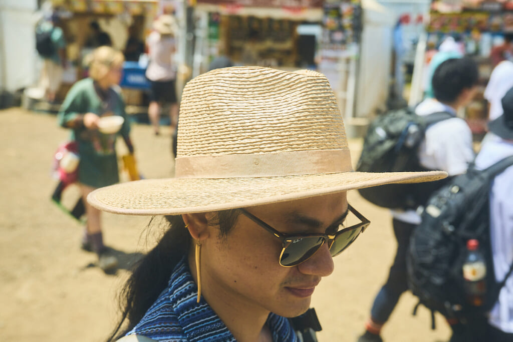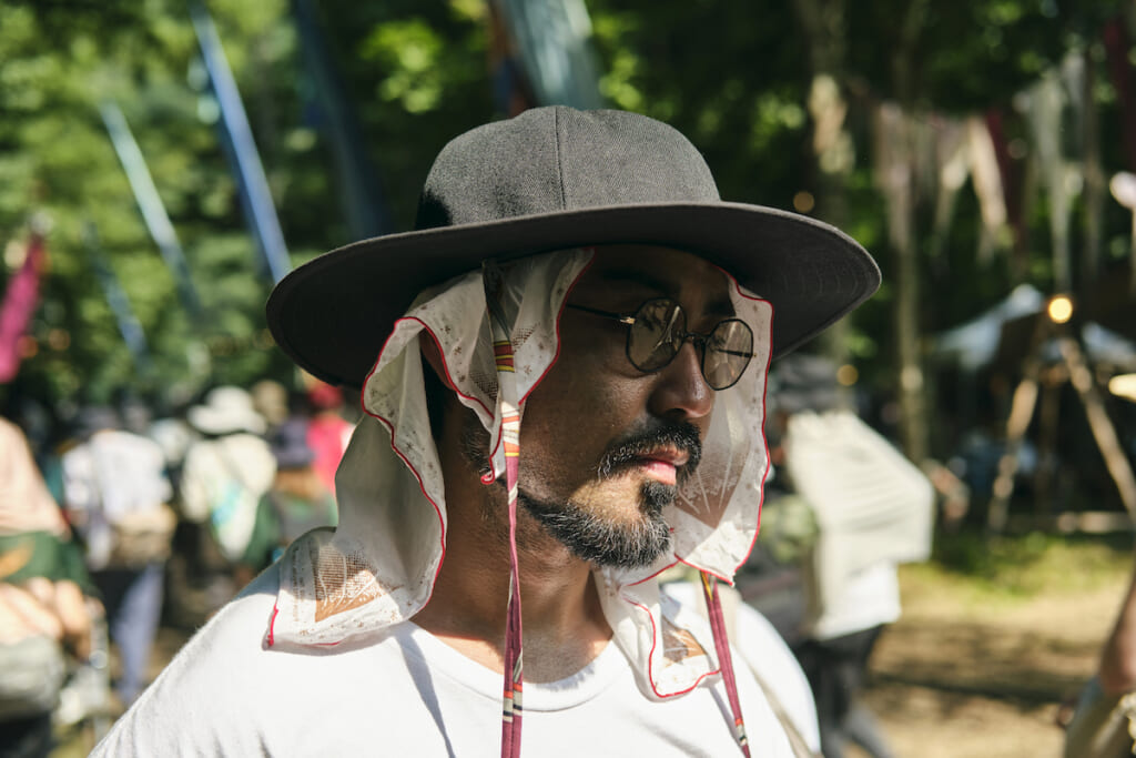 近年のフジロックは天候に恵まれている日が多く、雨が少ない分、日中は非常に強い日差しが襲ってくる。そんななかで近年定番となってきたのが、手ぬぐいや大判ストールを頭に巻くほっかむりスタイル。