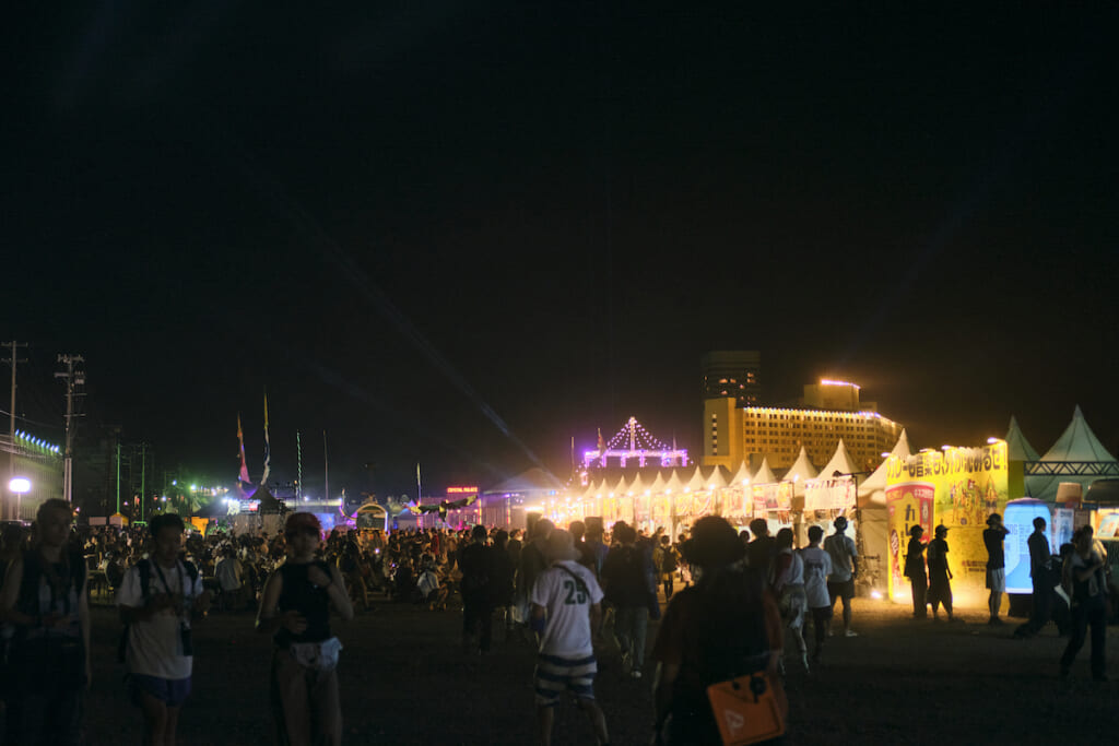 日が暮れると昼間の暑さが嘘かのような快適な気候となり、フジロックの夜はまだまだここから! 足取りも軽くなり、グリーンのヘッドライナーを観たり、ピースフルな空間のフィールドオブヘブンまで足を運んだり、深夜まで鳴り響くレッドマーキーやパレスオブワンダーで朝まで踊ったりと、非日常にどっぷりと浸れるのも魅力。