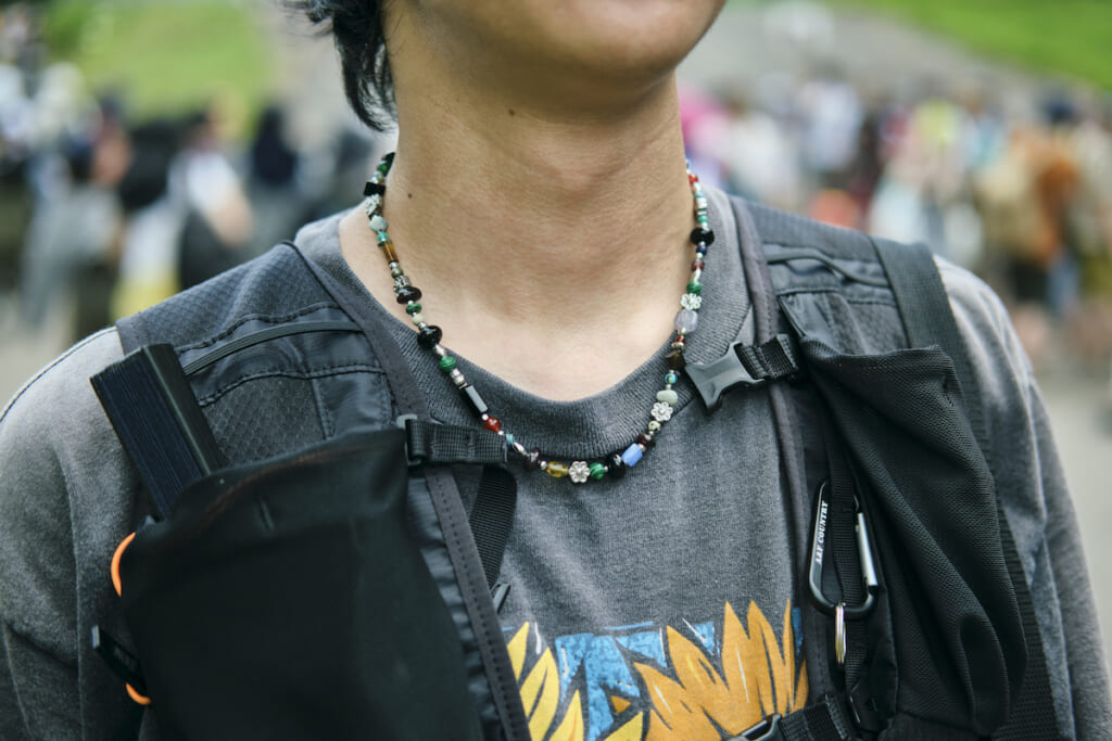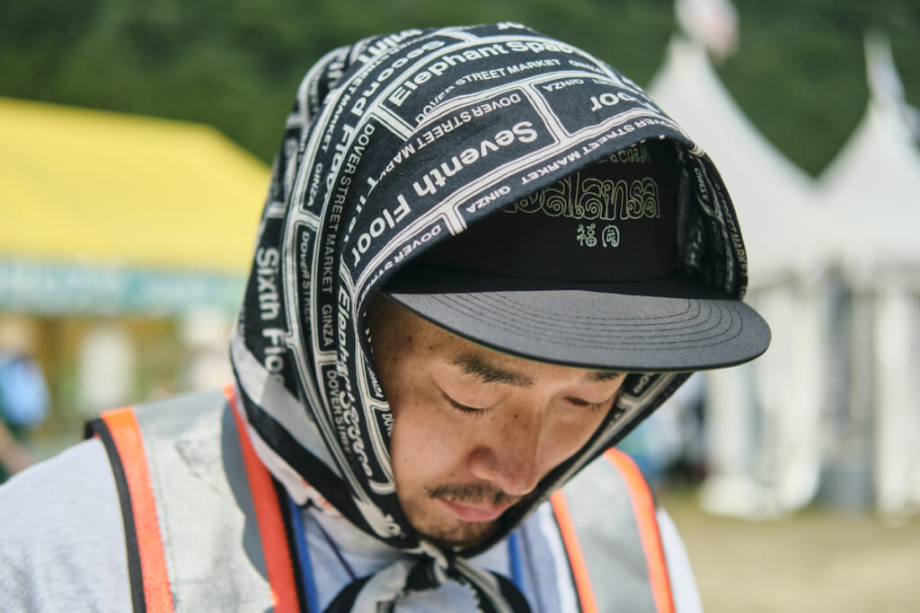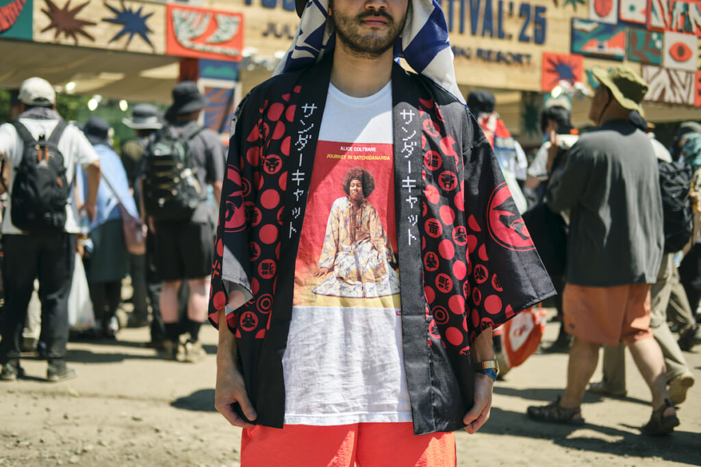 フジロックではアーティスト物販も長蛇の列ができ、出演アーティストのアイテムを現地で購入してすぐに身につけるってヒトも多いが、ほかのイベントで買ったり、古着を着用するヒトも多数。なかには、サンダーキャットのド派手な法被を見事に着こなすフジロッカーも。
