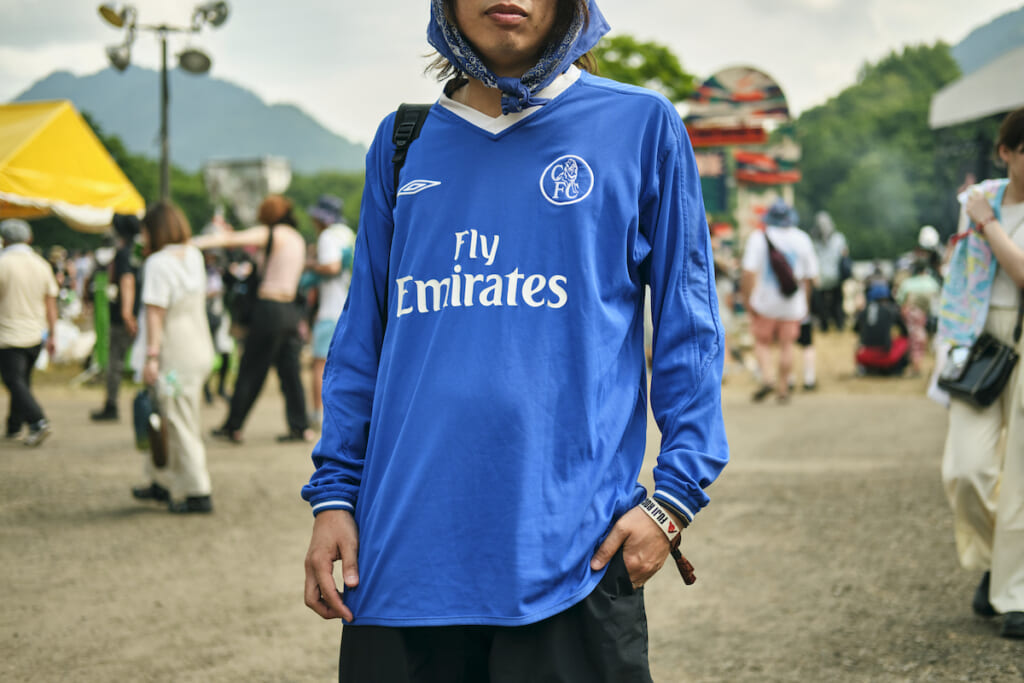 巷でブームとなっているサッカーのユニフォームはフェス会場でも。ゲームシャツとだけあって、吸水速乾などの機能性はもちろんのこと、国やクラブチームによってそのデザインもさまざま。ユニフォーム着用者同士が集まればどこがいい、あそこのが欲しいなんて会話にも発展。