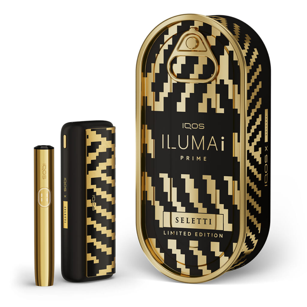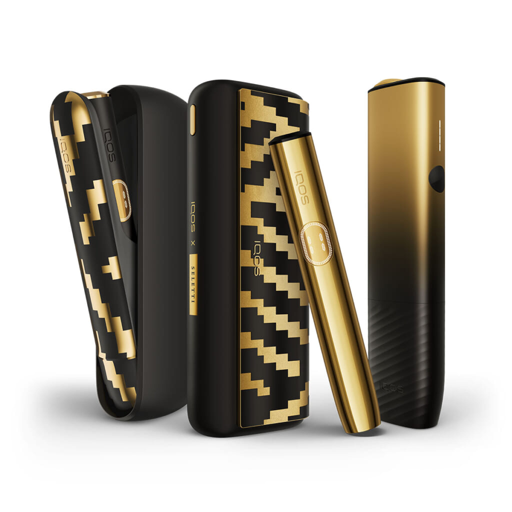 IQOS ILUMA i PRIME セレッティ モデルは、「SELETTI」の世界観と IQOS が融合した、エレガントな最上位モデル。ホルダーはゴールドカラーの輝く光沢感が特徴的で、チャージャーはブラックをベースとしたマットな質感でキット全体をエレガントに仕上げられている。